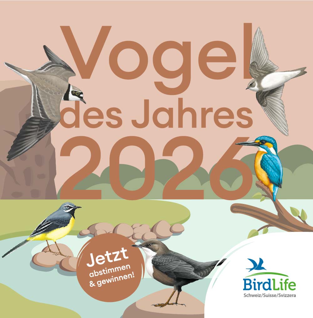 Mit der Wahl des Vogel des Jahres 2026 möchte BirdLife Schweiz darauf aufmerksam machen. Haben Sie Ihre Stimme schon abgegeben? Mit ein wenig Glück gibt es einen attraktiven Preis zu gewinnen. Den Vogel des Jahres 2026 gibt BirdLife Schweiz Ende November 2025 bekannt.